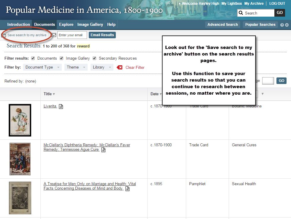 Popular Medicine in America, 1800-1900 features ‘My Archive’ and ‘My Lightbox’, where you can save documents and images from multiple search sessions, making your research experience more rewarding.