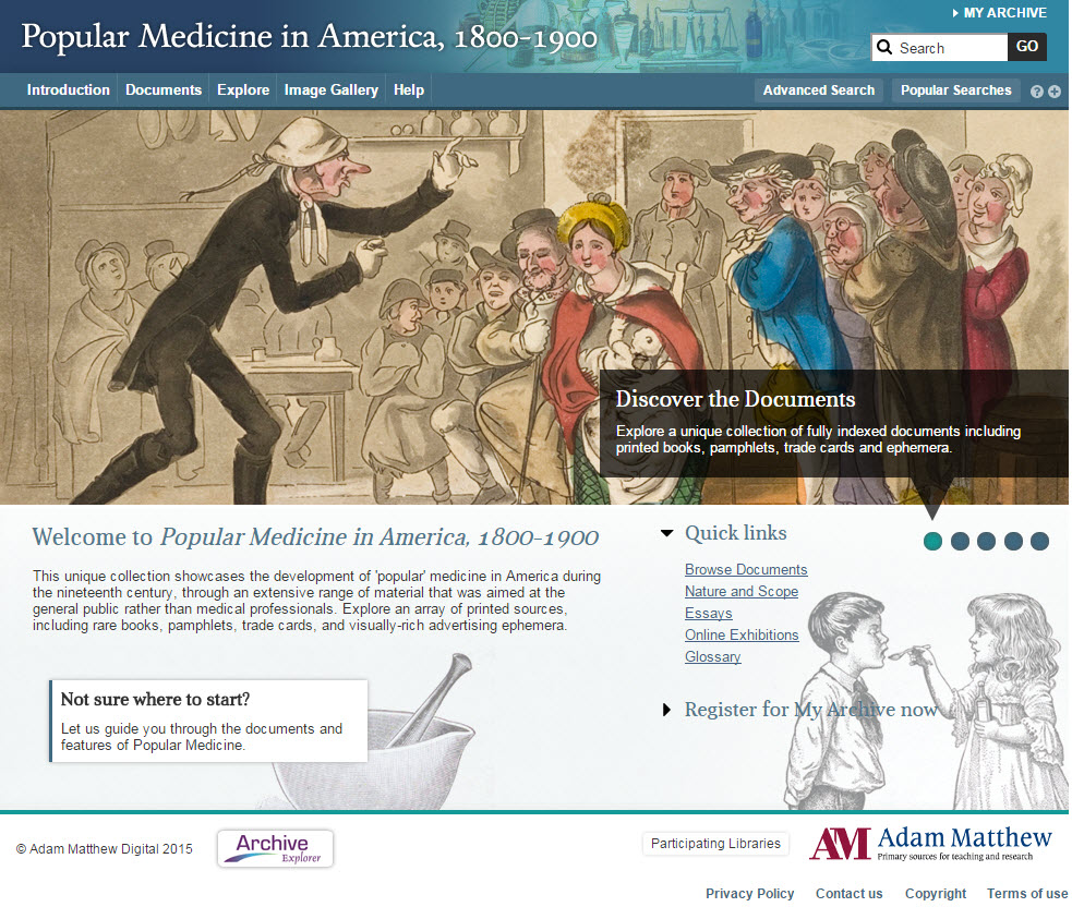 Popular Medicine in America, 1800-1900 gives users the chance to access an impressive collection of highly visual primary source material, which is complimented by supplementary features designed to aid both research and teaching. The collection offers a unique insight into the medicine chests and bookshelves of the everyday, nineteenth-century, American, through a colourful array of advertisements, popular texts and ‘self-help’ documents.